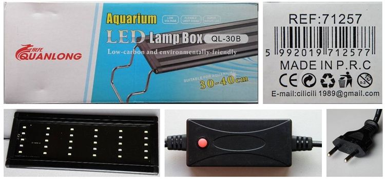 a csomagoláson QUANLONG márkanevű, QL-30B termékazonostó jelölésű és „Aquarium LED Lamp Box” megnevezésű, a csomagolásra ragasztott öntapadós matricán REF:71257 hivatkozási számú