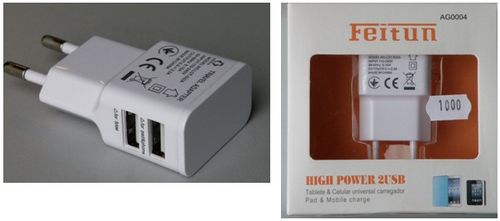 FEITUN márkajelű, LDT-032A modellszámú, a csomagolódobozon „2USB Charger 3100mA” feliratú és AG0004 jelölésű akkumulátortöltő